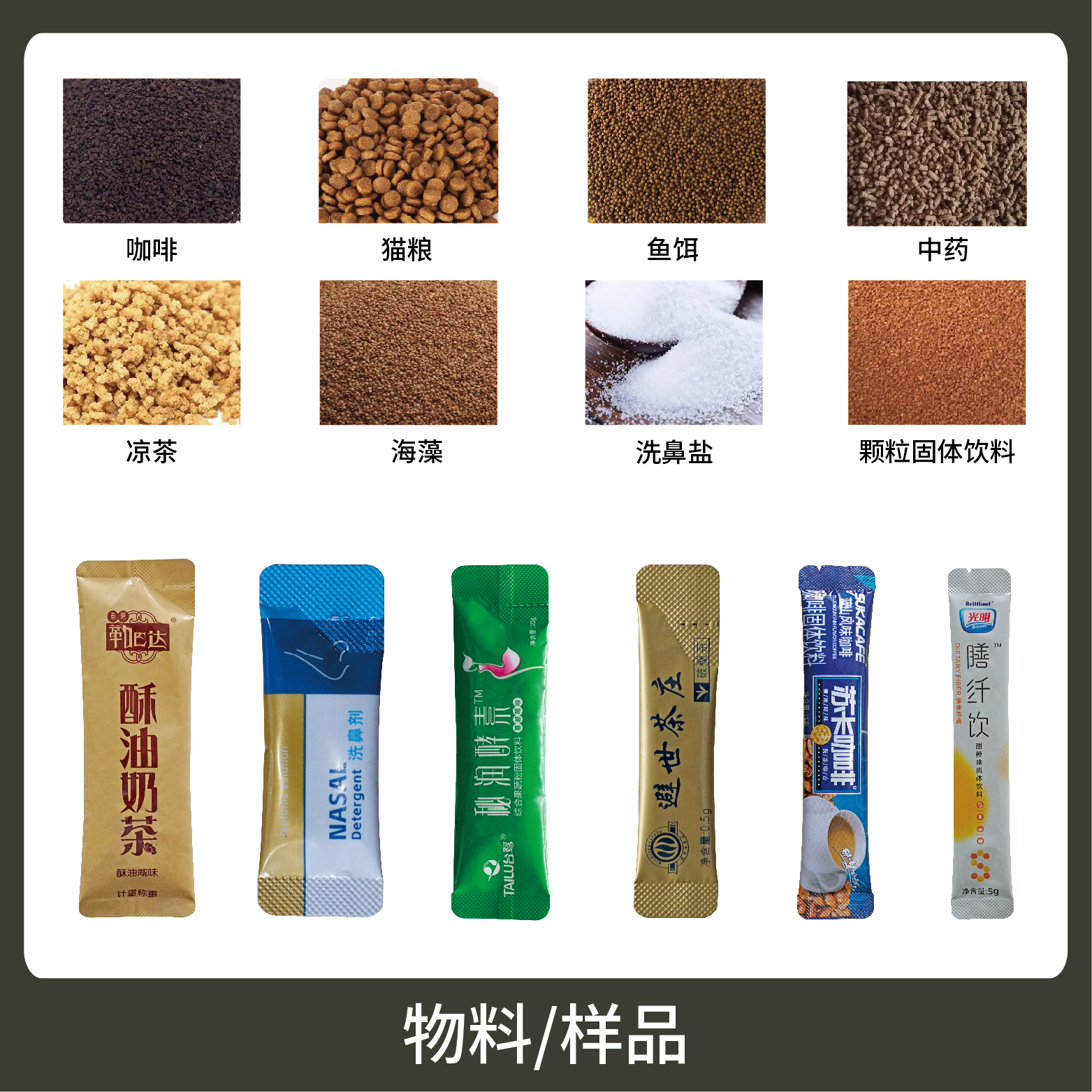 適用于食品、醫(yī)藥、化工、化妝品行業(yè)中顆粒物品的計量包裝,如:咖啡、保健品、營養(yǎng)品等。